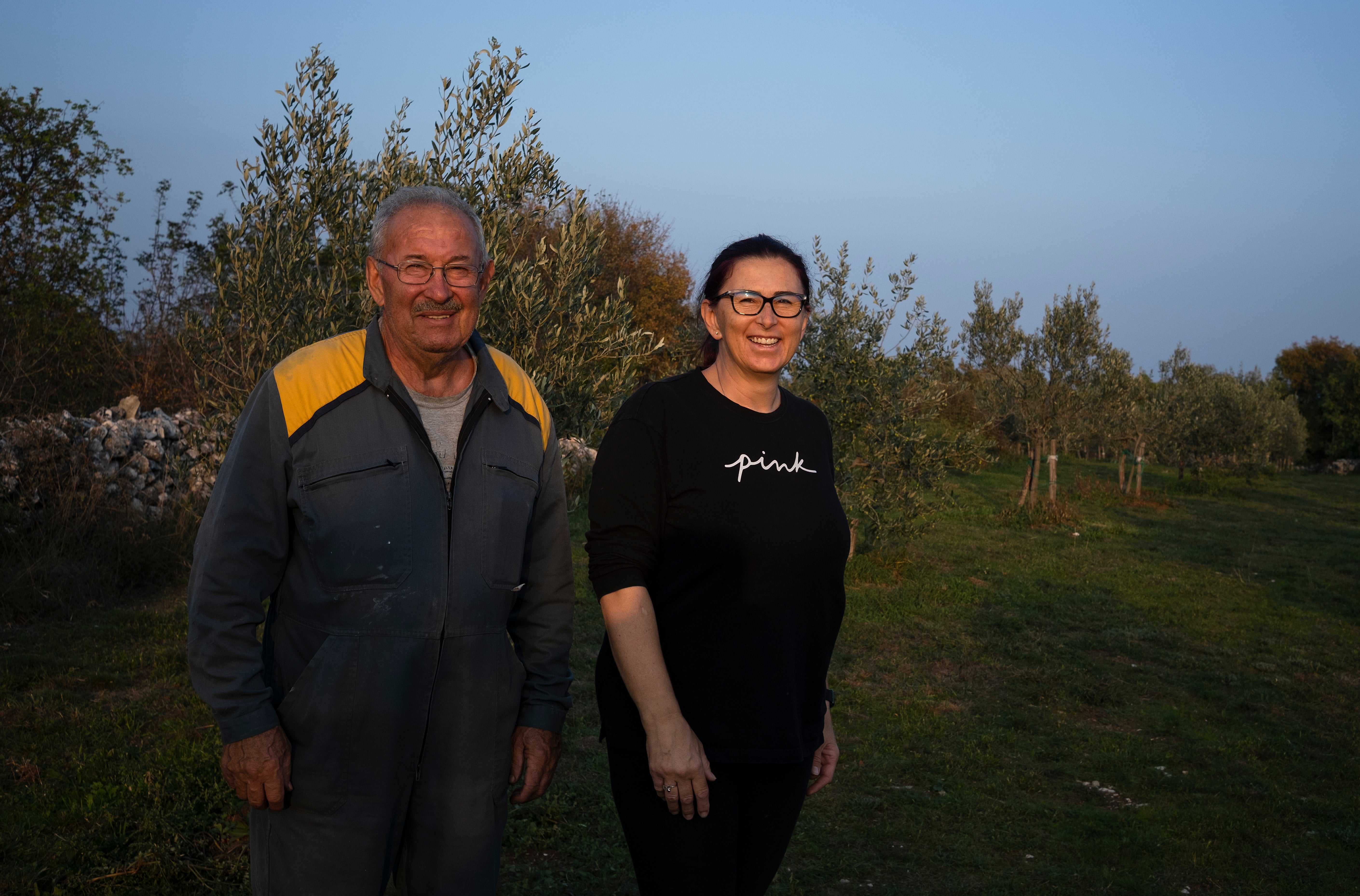 Nono Jakov, picture here with his daughter Aurora, is our expert on all things garden and farming. The field in which the olives were planted was passed down through his family, so he has grown up caring for these lands. He has had a fruitful garden for many years and produces his own wine. Jakov's tips and tricks, as well as his community and their knowledge, made all the difference when our olives were young and before we gathered our own knowledge of olive growing. His tractor brought all the necessities to our farm for many years, and still does to this day. You will often see him around the olive trees, checking and making sure they're as strong as can be.