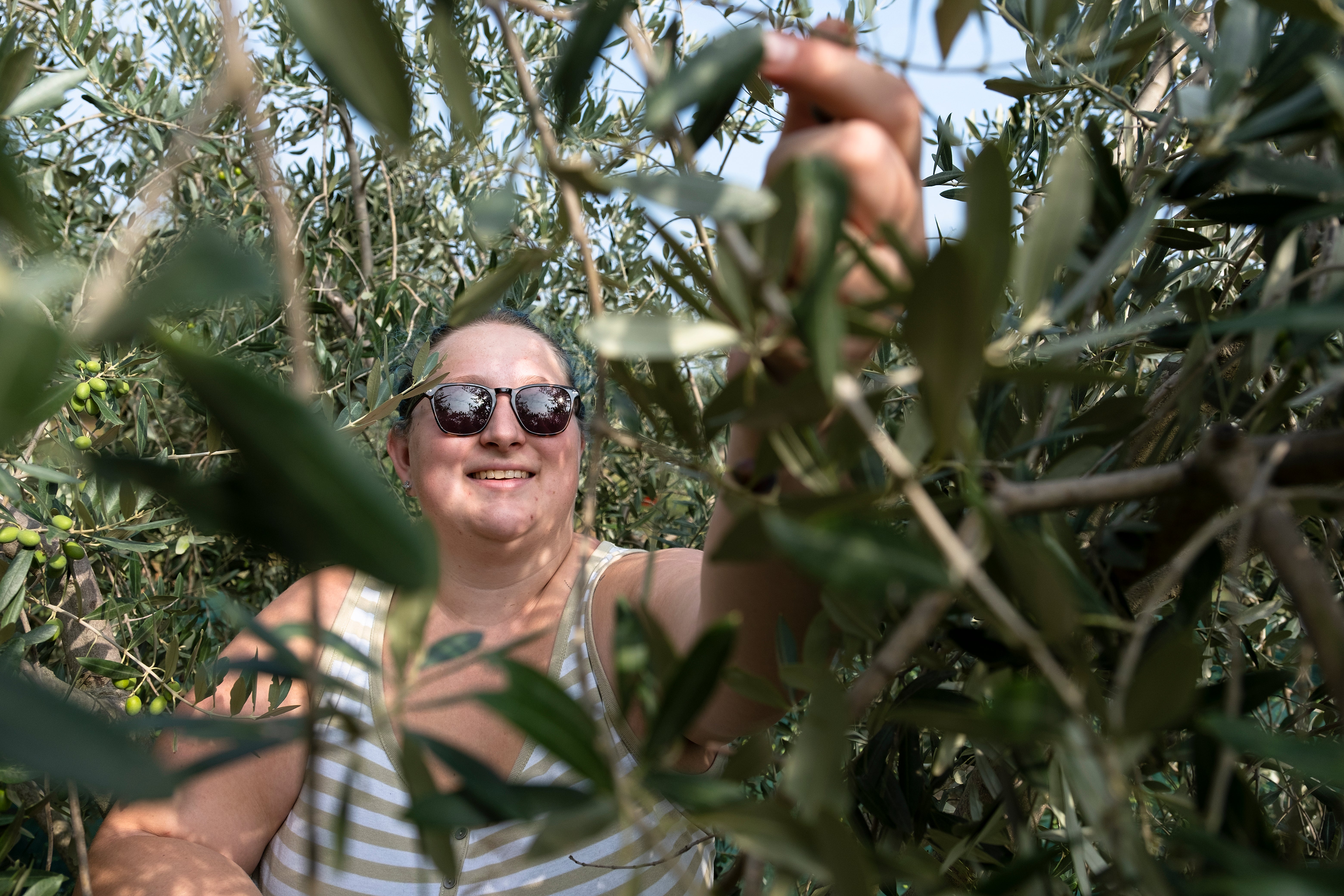 Helena is always easy to spot, with blue hair and tattoos, she tends to stand out in the small village of Mali Turini, where our olive field is located. Aurora's daughter lives in the Netherlands, so she can't spend as much time in the olive fields as the rest of the family. However, she makes up for it by using her time to manage our social media. Helena likes to create fun images and videos, having fun with the oil and olives. And don't worry, she wouldn't miss out on the harvest - that's where the best photo opportunities happen. In her spare time, she is usually messaging the rest of the family, asking them to take more photos and videos of our beautiful olive fields.
